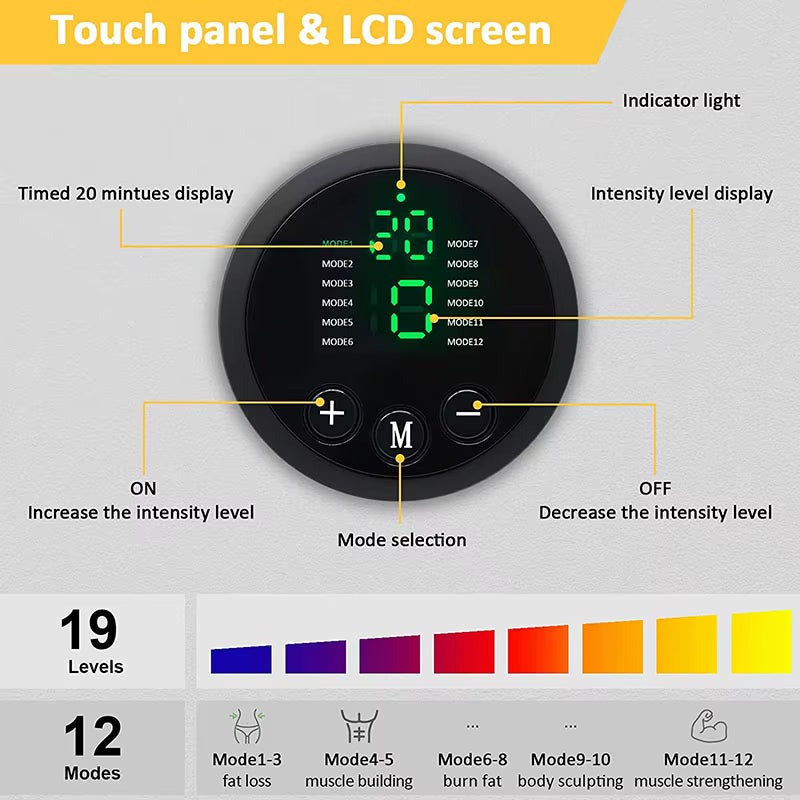 Magebeltet er utstyrt med 12 treningsmoduser og hele 19 intensitetsnivåer , slik at du enkelt kan tilpasse treningen til din erfaring og dine mål – fra lett aktivering til intens muskeltrening.